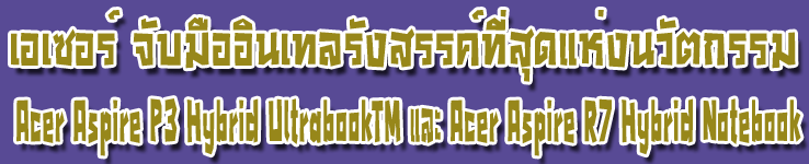 ที่ต้องการอุปกรณ์สำหรับการทำงานและบันเทิงไว้รวมกัน โดยการรวมคุณสมบัติเด่นๆ ของโน้ตบุ๊ค และแท็ปเล็ตมาไว้ด้วยกัน ไม่ว่าจะเป็นซีพียู ระบบปฏิบัติการ ระบบสัมผัสที่ลื่นไหลและความคมชัดของภาพ เสียง ฯลฯAcer Aspire P3 Hybrid UltrabookTM และ Acer Aspire R7 Hybrid Notebook เป็นอีกหนึ่งปรากฏการณ์ที่จะสร้างนิยามใหม่ของประสบการณ์การใช้งานคอมพิวเตอร์และอุปกรณ์โมบิลิตี้ต่างๆ ที่ได้กล่าวมาแล้ว และเช่นเคยเอเซอร์เป็นผู้นำนวัตกรรมนี้ เราแนะนำผลิตภัณฑ์กลุ่มไฮบริดเป็นรายแรกของประเทศไทย และในภูมิภาค ด้วยความร่วมมือและสนับสนุนจากอินเทล พันธมิตรที่ดีเสมอมาของเรา เราหวังว่าผู้ใช้และลูกค้าของเราจะพึงพอใจกับการเปลี่ยนแปลงล่าสุดนี้ และผลิตภัณฑ์ไฮบริดจะช่วยเติมเต็มและเชื่อมต่อโลกของการทำงานและบันเทิง |