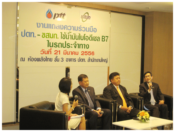 B7 ในรถประจำทางของ ขสมก. ในครั้งนี้ว่า ปตท. ให้ความสำคัญกับ การพัฒนาพลังงานทดแทนที่ผลิตจากพืชผลการเกษตรในประเทศ
