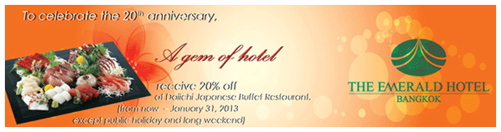 | ........ฉลอง 20 ปี รับส่วนลด 20% ทันที ที่ห้องอาหารญี่ปุ่นไดอิจิ โรงแรมดิ เอมเมอรัลด์ ฉลองครบรอบ 20 ปี มอบส่วนลด 20% ทันที จากราคาปกติท่านละ 600 บาท++ สำหรับลูกค้าทุกท่านที่มาทานบุฟเฟต์อาหารญี่ปุ่น ที่ห้องไดอิจิ ทั้งมื้อกลางวันและมื้อค่ำ อิ่มไม่อั้นกับซูชิ ซาซิมิ เทปปันยากิ เทมปุระ ชาบูชาบู รวมเครื่องดื่ม ขนมหวาน และผลไม้ นอกจากนี้ยังมีเมนูแนะนำที่ไม่ซ้ำกันในแต่ละเดือนด้วย โดยในเดือนมกราคม 2556 นี้เป็นเมนู "เนื้อโคขุน" รับสิทธิพิเศษนี้ได้ตั้งแต่วันนี้เป็นต้นไป จนถึงวันที่ 31 มกราคม 2556 ยกเว้นวันหยุดนักขัตฤกษ์และวันหยุดต่อเนื่อง เปิดบริการมื้อกลางวันเวลา 11.30 - 14.30 น. และ มื้อค่ำ 18.00 - 22.00 น. | |