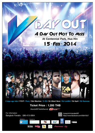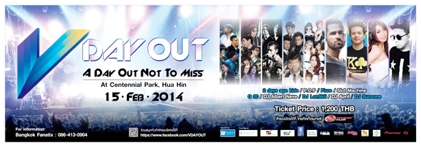 | ........สำหรับเทศกาลดนตรีสุดมันส์ V DAY OUT (วี เดย์ เอ้าท์) A Day Out Not To Miss (อะ เดย์ เอ้าท์ นอท ทู มิส) พร้อมเหล่าศิลปินตัวท็อปทั้งไทยและเทศ อาทิวง 2 Days ago kid / P.O.P / Flure / Slot Machine / G 20 / DJ LonSkii / DJ April / DJ Sunzone และ DJ Albert Neve จัดขึ้นในวันเสาร์ที่ 15 กุมภาพันธ์ 2557 เวลา 17.00 - 04.00 น. ณ เซนเทนเนียล ปาร์ค หัวหิน (Centennial Park, Hua-Hin) สามารถซื้อบัตรได้แล้วที่ ไทยทิคเก็ตเมเจอร์ทุกสาขา บัตรราคา 1200 บาท | |