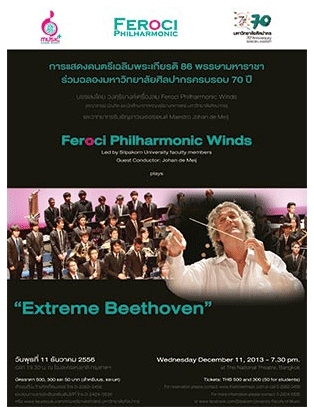 ........เนื่องในโอกาสครบรอบ 70 ปี ของมหาวิทยาลัยศิลปากร ซึ่งเป็นสถาบันศิลปะชั้นนำของประเทศไทย ที่มีความหลากหลายด้วยศิลปะวิทยาการต่างๆ รวมไปถึงศิลปะด้านดนตรี ทางคณะดุริยางคศาสตร์ จัดกิจกรรมดนตรี การแสดงดนตรีเฉลิมพระเกียรติ 86 พรรษามหาราชา มหาวิทยาลัยศิลปากร 70 ปี บรรเลงโดยวงดุริยางค์เครื่องลม Feroci Philharmonic Winds เพื่อเฉลิมพระเกียรติพระบาทสมเด็จพระเจ้าอยู่หัวฯ เนื่องในวโรกาสเฉลิมพระชนมพรรษา ครบรอบ 85 พรรษา และร่วมเฉลิมฉลองในโอกาสที่มหาวิทยาลัยศิลปากรครบรอบ 70 ปี และคณะดุริยางคศาสตร์ครบรอบ 15 ปี เพื่อเผยแพร่ศิลปะด้านดนตรีให้แพร่หลาย ผลิตผลงานดนตรีที่มีคุณภาพ ผสมผสาน และบูรณาการศาสตร์ต่างๆ อย่างสร้างสรรค์ และร่วมก้าวไปกับมหาวิทยาลัยศิลปากรตามสโลแกน "โบยบินสู่อนาคตแห่งการสร้างสรรค์" ในโอกาสครบรอบ 70 ปี โดยคัดเลือกบทเพลงอันยิ่งใหญ่ทั้งของไทย และต่างประเทศ อาทิ บทเพลง Medley บทเพลงพระราชนิพนธ์ "King Bhumibol Suite" เรียบเรียงเสียงประสานโดย อาจารย์เลิศเกียรติ จงจิรจิต บทเพลง "Ritratto di Feroci" ประพันธ์โดยคณาจารย์คณะอักษรศาสตร์ และคณะดุริยางคศาสตร์ เพื่อเป็นบทเพลงระลึกถึงเกียรติคุณของศาสตราจารย์ศิลป์ พีระศรี ที่มีต่อวงการศิลปะร่วมสมัยของไทย โดยใช้เครื่องดนตรีไทย เครื่องดนตรีสากล และนักพากย์ ร่วมกันบรรเลงในแบบไทยร่วมสมัย........ |
