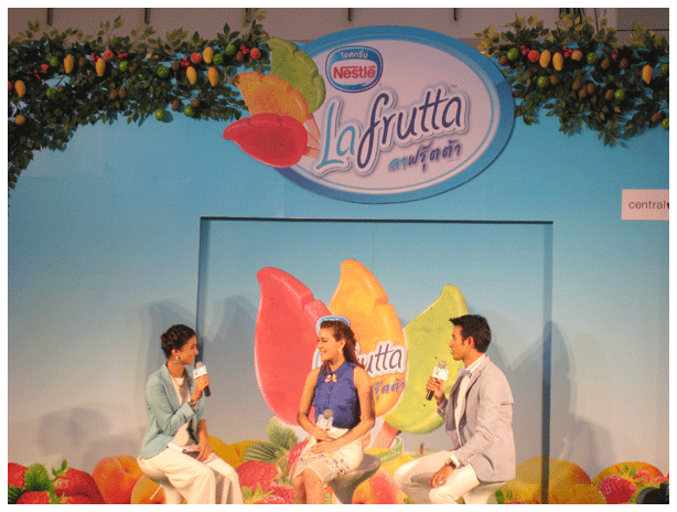 | ........ นอกจากนี้ ภายในงานยังได้รับเกียรติจากเหล่าเซเลบริตี้หนุ่มสาวรุ่นใหม่ที่ใส่ใจสุขภาพให้ความสนใจมาร่วมงานเป็นจำนวนมาก เพื่อลิ้มลองสัมผัสความเนียนนุ่มจากเนื้อผลไม้แท้ๆ สร้างประสบการณ์ในการดูแลสุขภาพ พร้อมคลายร้อน ในรูปแบบที่แตกต่างออกไปอีกด้วย "ใหม่! เนสท์เล่ ลาฟรุ๊ตต้า ดื่มด่ำสัมผัสเนียนนุ่มจากเนื้อผลไม้แท้" | |