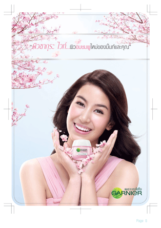 **ผิวชั้นนอก เมื่อใช้เป็นประจำอย่างต่อเนื่อง ***ผลการทดลองในห้องปฏิบัติการ " การ์นิเย่ ซากุระ ไวท์ โฟม จุดเริ่มต้นของการดูแลผิว ต้องเริ่มที่ทำความสะอาดผิวอย่างล้ำลึก แต่อ่อนโยนกับผิว เพื่อเผยผิวกระจ่างใส อมชมพูดุจซากุระทุกวัน " การ์นิเย่ ซากุระ ไวท์ เดย์ครีม SPF21 PA/+++ บำรุงผิวล้ำลึกชั้นต่อชั้น แต่อ่อนโยน เพื่อผลิผิวดูกระจ่างใส อมชมพูสะพรั่งดุจซากุระ พร้อมปกป้องผิวจากรังสี UV " การ์นิเย่ ซากุระ ไวท์ มาส์ก อีกขั้นแห่งการบำรุงผิวอย่างล้ำลึก รวดเร็ว เพื่อผิวดูกระจ่างใส อมชมพูสะพรั่งทันที เนียนนุ่ม ชุ่มชื่น คงผลลัพธ์ยาวนานจนคุณรู้สึกได้ |