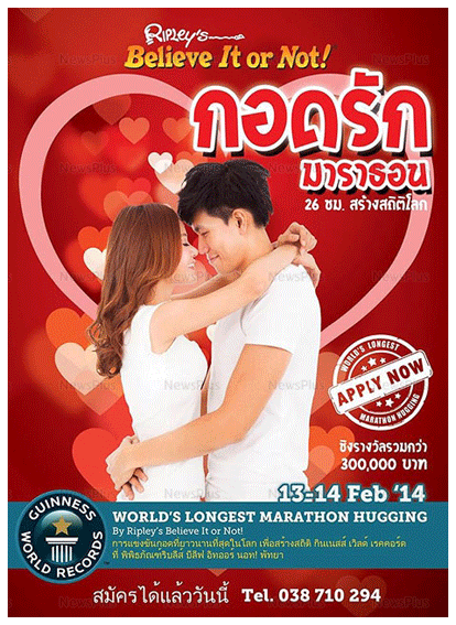 ซึ่งล้วนแล้วแต่ประสบความสำเร็จและได้รับการกล่าวถึงทั้งในระดับประเทศและนานาชาติ" ........."ในปีนี้ก็ได้เปิดโอกาสให้ประชาชนทั่วไปสามารถเข้ามามีส่วนร่วมในการแสดงออกซึ่งความรัก ความห่วงใยที่มีต่อกันและกันได้ ทั้งในรูปแบบคู่รัก ญาติพี่น้อง หรือเพื่อนสนิท โดยผู้เข้าแข่งขันจะต้องมีอายุ 18 ปีขึ้นไป หรือในกรณีที่ผู้เข้าแข่งขันมีอายุระหว่าง 18-20 ปี จะต้องได้รับความยินยอมจากผู้ปกครองก่อนการลงสมัคร ระหว่างการแข่งขันแขนของทั้งคู่จะต้องอยู่ในท่าโอบกอดกันและกันตลอดเวลา เป็นเวลาทั้งสิ้น 26 ชั่วโมง โดยกฎกติกาที่ใช้ในการแข่งขันครั้งนี้ เป็นกติกากลางที่ทางกินเนสเวิลด์เรคคอร์ดเป็นผู้กำหนด จึงมั่นใจได้ว่าการแข่งขันในครั้งนี้จะมีความโปร่งใสเทียบเท่าการแข่งขันในระดับนานาชาติ" ........ผู้ชนะที่สามารถสร้างสถิติโลกใหม่จะได้รับรางวัลมูลค่ารวมกว่า 300,000 บาท การแข่งขันจะดำเนินอยู่เวลาสองวัน ระหว่างวันที่ 13 - 14 กุมภาพันธ์ 2557 ณ พิธภัณฑ์ริบลีส์ บีลีฟอิทออร์นอท! พัทยา ชั้น 2 ศูนย์การค้ารอยัล การ์เด้น พลาซ่า พัทยา ........ผู้สนใจและมีคุณสมบัติครบถ้วนตามระบุ สามารถสมัครเข้าร่วมการแข่งขันได้ตั้งแต่วันนี้ถึง 10 กุมภาพันธ์นี้ ที่ริบลีส์ บีลีฟอิทออร์นอท! พัทยา หรือสอบถามเพิ่มเติมที่หมายเลข 038 710 294-8 ต่อ 163 กฎ-กติกา การแข่งขัน 1. การกอดจะต้องมีขึ้นอย่างต่อเนื่อง โดยที่แขนทั้งสองข้างของผู้เข้าแข่งขันจะต้องโอบรอบตัวของกันและกันตลอดเวลาการแข่งขัน 2. หากแขนที่โอบรอบตัวผู้เข้าแข่งขันหลวมหรือหลุด แยกออกจากกัน ถือว่าผู้เข้าแข่งขันคู่นั้นหมดสิทธิ์และตกรอบไปในทันที 3. ผู้เข้าแข่งขันจะต้องมีอายุ18 ปีขึ้นไป หรือในกรณีที่ผู้เข้าแข่งขันมีอายุระหว่าง 18-20 ปี จะต้องได้รับความยินยอมจากผู้ปกครองก่อนการลงสมัคร 4. ผู้เข้าแข่งขันจะต้องรู้สึกตัวตื่นอยู่ตลอดเวลา 5. ไม่อนุญาติให้ผู้เข้าแข่งขันขยับแขนหรือเปลี่ยนท่าทางระหว่างการแข่งขัน หากผู้เข้าแข่งขันมีอาการคัน หรือต้องการความช่วยเหลืออื่นๆ อนุญาตให้ขอความช่วยเหลือจากกรรมการที่ควบคุมการแข่งขันได้เพื่อไม่ให้แขนของผู้เข้าแข่งขันหลุดออกจากกัน รวมถึงอนุญาตให้มีการขยับนิ้วมือระหว่างการแข่งขันได้ 6. ผู้เข้าแข่งขันจะต้องยืนตลอดระยะเวลาการแข่งขันและไม่อนุญาตให้ใช้อุปกรณ์ในการค้ำยัน หรือประคองซึ่งกันและกันตลอดระยะเวลาการแข่งขัน 7. ไม่อนุญาตให้ผู้เข้าแข่งขันออกนอกสนามแข่งในระหว่างการแข่งขัน 8. ผู้เข้าแข่งขันสามารถหยุดพักเพื่อเข้าห้องน้ำได้ |