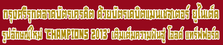 | ........ นายกฤษณ์ จันทโนทก ผู้ช่วยกรรมการผู้จัดการใหญ่ สายงานธุรกิจเงินฝาก การลงทุน ประกันภัย และธนบดี ธนาคารกรุงศรีอยุธยา จำกัด (มหาชน) กล่าวว่า "กรุงศรีเป็นธนาคารเดียวในประเทศไทยที่ได้รับสิทธิ์อย่างเป็นทางการ เทียบเท่าพันธมิตรระดับโลก กับสโมสรแมนเชสเตอร์ ยูไนเต็ด ในการออกผลิตภัณฑ์ทางการเงิน และเพื่อร่วมฉลองประวัติการครองแชมป์ที่ยาวนานถึง 20 สมัย และการมาเยือนเมืองไทยอย่างเป็นทางการ กรุงศรีจึงได้เปิดตัวบัตรเดบิตแมนเชสเตอร์ ยูไนเต็ด ลายหน้าบัตรใหม่ CHAMPIONS 2013 เพื่อตอกย้ำความยิ่งใหญ่ของสโมสร และมอบความสุขให้กับแฟนบอลชาวไทยและสาวกปีศาจแดงทุกคน" | |