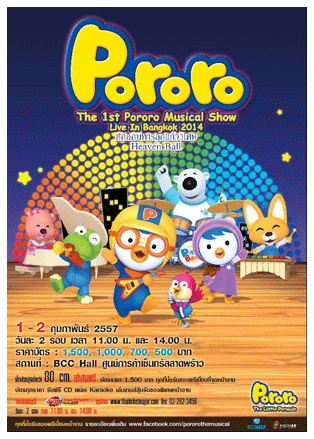 ........"โพโรโระ เพนกวินป่วน ก๊วนข้ามโลก" เจ้าเพนกวินสีฟ้าจอมป่วน การ์ตูนแอนนิเมชั่น ชื่อดังจากประเทศเกาหลี ซึ่งหลังจากโด่งดังและประสบความสำเร็จอย่างมากในประเทศบ้านเกิดกันไปแล้ว มาตอนนี้ คนไทยกำลังจะได้พบกับความน่ารักของเจ้าเพนกวินสีฟ้าตัวนี้และผองเพื่อน ในรูปแบบ Musical Show ที่กำลังจะมามอบความสุขความสนุกปนความน่ารักให้กับน้องๆ หนูๆชาวไทย พร้อมกับตอนพิเศษที่ทำการแสดงเพื่อประเทศไทยเท่านั้น ใน "2013 Pororo The Musical Live Show in Bangkok ตอน ศึกอภินิหารลูกแก้ววิเศษ" โดยเป็นเรื่องราวเกี่ยวกับการต่อสู้แย่งชิงลูกแก้วที่มีอำนาจวิเศษของดวงดาวฝ่ายร้ายและดวงดาวฝ่ายดี ซึ่งมีเจ้าโพโรโร และผองเพื่อนคอยช่วยเหลือ ........ส่วนบทสรุปของตอนนี้จะเป็นอย่างไร ไปหาคำตอบพร้อมกันได้ ในวันที่ 1-2 กพ. 57 นี้ โดยจะเปิดการทำการแสดงวันละ 2 รอบ คือ เวลา 11.00 น. และ 14.00 น. BCC Hall เซนทรัลลาดพร้าว จำหน่ายบัตรแล้ววันนี้ ที่ไทยทิกเก็ตเมเจอร์ ทุกสาขา ราคาบัตร 1,500 , 1,000 , 800 , 500 บาท (กรุงเทพฯ) และจะเปิดการแสดงที่จังหวัดเชียงใหม่ วันที่ 15 กุมภาพันธ์ 2557 ณ เชียงใหม่ฮอลล์ เซนทรัลพลาซ่าเชียงใหม่ แอร์พอร์ต 2 รอบ เวลา 11.00 น. และ 14.00 น. และจังหวัดขอนแก่น วันที่ 1 มีนาคม 2557 ณ ขอนแก่นฮอลล์ เซนทรัลพลาซ่าขอนแก่น 2 รอบ เวลา 11.00 น. และ 14.00 น.ราคาบัตรที่ต่างจังหวัด 900 , 700 , 500 บาท |