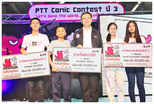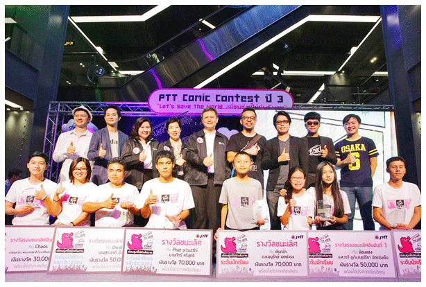 ........นายประเสริฐ สลิลอำไพ ผู้ช่วยกรรมการผู้จัดการใหญ่สื่อสารองค์กรและกิจการเพื่อสังคม บริษัทปตท.จำกัด(มหาชน)เป็นประธานในพิธีมอบรางวัล "งานประกาศผลรางวัล โครงการ PTT Comic Contestปี 3" ตอน "Let's Save The World เมื่อพรุ่งนี้ไม่มีพลังงาน"กับโครงการประกวดวาดการ์ตูนระดับประเทศ โดยมอบรางวัลแก่ผู้ชนะการประกวดรุ่นใหม่รวม20 รางวัล จากผู้สมัครทั้ง 2 รุ่น ได้แก่ ประเภทนักเรียนอายุระหว่าง 13-18 ปี และประเภทนักศึกษาหรือบุคคลทั่วไป อายุ 18 ปีขึ้นไป ที่ได้แสดงศักยภาพในด้านความคิดสร้างสรรค์ผ่านลายเส้นการ์ตูน ซึ่งสามารถช่วยในการสื่อสารสร้างความเข้าใจในสังคม และรณรงค์ให้เยาวชนรวมถึงประชาชนทั่วไป ตระหนักถึงความสำคัญของพลังงานที่เป็นปัจจัยหลักในการดำรงชีวิตซึ่งกำลังจะหมดไปได้อย่างตรงโจทย์และเกิดประโยชน์สูงสุดโดยผลงานทุกเรื่องได้ผ่านการพิจารณาชี้ขาดเป็นเอกฉันท์จากคณะกรรมการผู้ทรงคุณวุฒิในวงการการ์ตูนไทย อาทิ ทรงศีล ทิวสมบุญ,สุทธิชาติ ศราภัยวานิช, วีระชัย ดวงพลา(เดอะดวง), ธนิสร์ วีระศักดิ์วงศ์(ภูมิ สะอาด), วิศุทธิ์ พรนิมิตร และผู้บริหารจาก บริษัท ปตท. จำกัด (มหาชน) รวมถึง ฌอห์ณ จินดาโชติ พิธีกร และ ศิลปินวง 'รูม 39' |