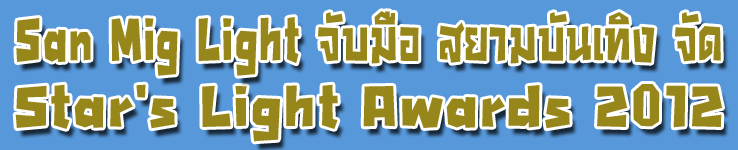 ........แคมเปญ Star's Light Awards 2012 เปิดให้ดาราโหวตดาราและให้แฟนๆ ร่วมโหวตดารา 3 สาขาที่ชื่นชอบ และเปิดให้ทุกคนได้มีส่วนร่วมสนุกไปกับการประกวด Star's Light searching Smart & Slim Guy & Girl จัดเต็มทั้ง 5 สถานบันเทิงเรียกเสียงกริ๊ดสนั่น ปิดท้ายความสนุกมินิคอนเสิร์ตศิลปินSo Cool, Instinct, Crescendo, Lula งานนี้ผู้ชนะจากทั้ง 5 ยังมีสิทธิเข้าร่วมงานกระทบไหล่ดาราดังอีกด้วย พร้อมเปิดให้ทุกคนได้โหวตดารา 3 สาขา ได้แก่ "ฟิต&เฟิร์มละลายใจ", "หนุ่มเจ้าสำราญ" และ "Shape Approved" คึกคักไม่น้อยหน้ากับการโหวตของดารากันเองใน 7 สาขา ได้แก่ "ตาคมบาดใจ", "ขาเรียวเกี่ยวใจ", "ผิวนวลชวนมอง", "กล้ามแขนน่าหนุน", "อึ๋มอกอึ๋มใจ","ผมสวยมัดใจ", "SexyLipsHotSinger" |