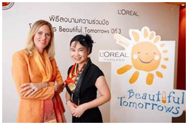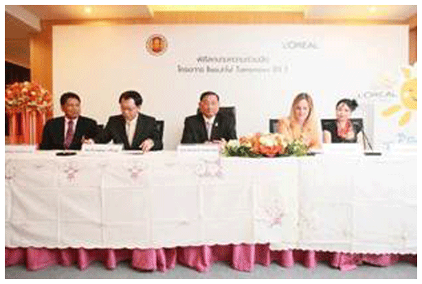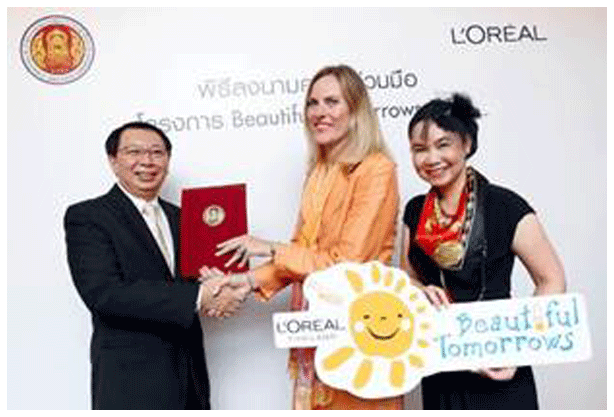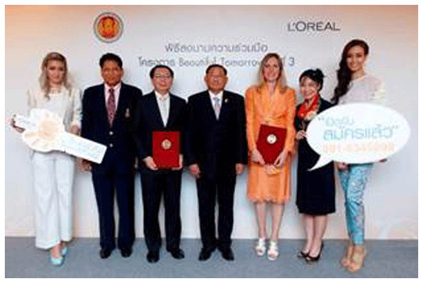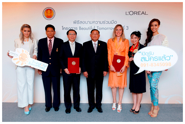 (Beautiful Tomorrows) ปีที่ 3 โครงการทุนฝึกทักษะอาชีพเสริมสวยเพื่อผู้ด้อยโอกาสในสังคม โดยการสนับสนุนของมูลนิธิลอรีอัล ประเทศฝรั่งเศส และพันธมิตรของโครงการฯ คณะกรรมการการอาชีวศึกษา กระทรวงศึกษาธิการ ซึ่งตอกย้ำเจตนารมณ์ของลอรีอัลที่เชื่อว่า ความงามมีพลังที่จะเปลี่ยนแปลงชีวิต ทุกคนได้ โดยพิธีลงนามจัดขึ้น ณ สำนักงานคณะกรรมการการอาชีวศึกษา กระทรวงศึกษาธิการ เมื่อเร็วๆนี้ |