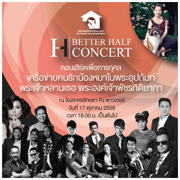 .......และเนื่องในโอกาสครบรอบปีที่ 5 ของเครือข่ายคนรักน้องหมาในพระอุปถัมภ์ พระเจ้าหลานเธอ พระองค์เจ้าพัชรกิติยาภา ขอเชิญทุกท่านร่วมชมคอนเสิร์ตการกุศล H : BETTER HALF CONCERT ในวันเสาร์ที่ 17 ตุลาคม 2558 เวลา 17.00 น. เป็นต้นไป ณ โรงละครอักษรา คิง พาวเวอร์ ซอยรางน้ำ เพลิดเพลินไปกับการเลือกซื้อสินค้าจากร้านค้าส่วนพระองค์ฯ อิ่มอร่อยไปกับ Food station & wine station จากฝีมือการปรุงอย่างพิถีพิถันของเหล่าเชฟชื่อดัง อาทิ เชฟหม่อมหลวงศิริเฉลิม สวัสดิวัตน์, เชฟชุมพล แจ้งไพร, เชฟบุญธรรม ภาคโพธิ์ ฯลฯ พร้อมร่วมประมูลสินค้าจากโครงการอีกมากมาย |