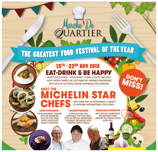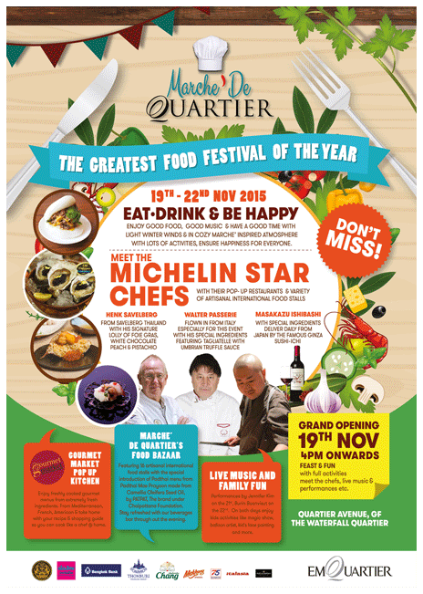 ที่มีแต่ความสนุก" ......."โดยเทศกาลอาหาร Mache De Quartier ที่จัดขึ้น 4 วันนี้ เรียกว่าเป็นจุดเริ่มต้นของการสร้าง International Food Cuisine Destination ให้เกิดขึ้นในย่าน ดิ เอ็ม ดิสทริค และสุขุมวิท เพื่อให้แตกต่างจากเทศกาลอาหารทั่วไป เราพยายามสร้างHappiness หรือความสุข จากทุกๆสัมผัสในงาน ให้ทุกท่านที่ร่วมงานมีประสบการณ์ร่วมกัน ทั้งความสุขกับอาหารที่ไม่ธรรมดาแต่จับต้องได้ ความสุขจากสุดยอดเอ็นเตอร์เทนเม้นท์ ที่รวมนักเอ็นเตอร์เทนเนอร์ระดับประเทศ และที่ขาดไม่ได้ คือ บรรยากาศในการสร้างให้เกิดความสุขที่สมบูรณ์แบบในรูปแบบของ "ปาร์ตี้" ที่ทุกคนสามารถมารับประทานอาหาร มาสนุกร่วมกัน อย่างที่เราเรียกกันว่า Life is a Party ปาร์ตี้ของคนที่นัดเพื่อนมารวมตัวกันในโอกาสพิเศษต่างๆ ปาร์ตี้เพื่อรวมตัวกันระลึกในสิ่งที่ประทับใจ ปาร์ตี้เพื่อแบ่งปันความสุขกับคน และสังคมรอบข้าง โดยมี "Cuisine" ของเรา ที่เป็น International Food Cuisine เป็นศูนย์กลางของทุกความสุขที่มารวมกัน เพื่อสร้าง Happiness is All Around" .......ในส่วนของอาหาร งานนี้เป็นโอกาสสำคัญที่ทุกท่านสามารถร่วมชิมอาหารฝรั่งเศส, ญี่ปุ่น และอิตาเลี่ยนระดับมิชลินสตาร์ครั้งแรก ในราคาเริ่มต้นเพียง 150 บาท เท่านั้น เช่น อาหารฝรั่งเศส จาก เชฟแฮงค์ ซาเวลเบิร์ก (Henk Savelberg) ร้านซาเวลเบิร์ก ไทยแลนด์ และอีก 4 สาขาในยุโรป อาทิ หอยนางรมนำเข้าจากไอซ์แลนด์ สายพันธุ์มาเจสติก รมควัน เสิร์ฟพร้อมซอสแกงเขียวหวาน และซอสพอนซึ เกล็ดน้ำแข็ง (Smoked irish oyster from the Big Green Egg with green curry and ponzu), ลอลลี่ป๊อป ฟัวกรา สอดไส้พีช เคลือบไวท์ ช็อคโกแลต โรยด้วยถั่วพิตาชิโอ (Lolly of foie gras, white chocolate peach and pistachio), โฮมเมดโยเกิร์ต และซอสคาราเมล ราดด้วยเกล็ดน้ำแข็งผลไม้สีเหลืองจากมะม่วง, เสาวรส และส้ม (Strained yoghurt with spice infused caramel and granite of yellow fruit), สแกมปี้ (กุ้ง) กับสลัดมะเขือเทศ สูตรดั้งเดิมของร้าน (Sous vide scampi grilled on the Big Green Egg with a salade of locale heirloom tomato) |
