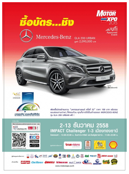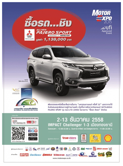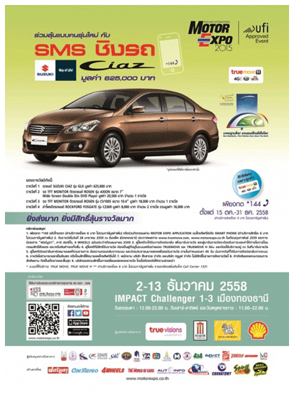 SMS ชิงรถ, ซื้อรถมอเตอร์ไซค์ ชิงบิ๊กไบค์, ซื้อสินค้า ชิงรางวัล ฯลฯ มีรายละเอียดดังต่อไปนี้ 1. "ซื้อรถ...ชิง MITSUBISHI PAJERO SPORT" เมื่อจองหรือซื้อรถยนต์ใหม่ภายในงาน มีสิทธิ์ชิงรางวัลรถยนต์ MITSUBISHI PAJERO SPORT รุ่นGLS-LTD (2WD) มูลค่า 1,138,000บาท จำนวน 1 รางวัล 2. "ซื้อบัตร...ชิง MERCEDES-BENZ" ผู้ที่ซื้อบัตรชมงาน มีสิทธิ์ชิงโชครถยนต์ MERCEDES-BENZ รุ่นGLA 200 มูลค่า 2,090,000 บาท จำนวน 1 รางวัล 3. "SMS ชิงรถ" หรือ กิจกรรม "ร่วมลุ้นแบบคนรุ่นใหม่" เพียงกด *144 แล้วโทรออก (ค่าบริการครั้งละ 6 บาท ไม่รวมภาษีมูลค่าเพิ่ม) หรือร่วมกิจกรรมผ่าน MOTOR EXPO APPLICATION บน โทรศัพท์มือถือ SMART PHONE (ค่าบริการสิทธิ์ละ 6 บาท ไม่รวมภาษีมูลค่าเพิ่ม) สามารถร่วมลุ้น ชิงรถยนต์ SUZUKI CIAZ รุ่น GLX มูลค่า 625,000 บาท จำนวน 1 รางวัล พร้อมรางวัลพิเศษอีกมากมาย 4. "ซื้อมอเตอร์ไซค์ ชิงบิ๊กไบค์" เมื่อจองหรือซื้อรถจักรยานยนต์ใหม่ในงานมีสิทธิ์ชิงรางวัลรถจักรยานยนต์ HONDA รุ่น NC750X มูลค่า 356,000บาท จำนวน 1 รางวัล 5. "ซื้อสินค้า ชิงรางวัล" เมื่อซื้อสินค้าภายในงานจากร้านเดียวกันทุกๆ 1,000 บาท จะได้รับคูปอง ชิงโชค 1 ใบ เพื่อลุ้นรางวัลมากมาย รวมมูลค่ากว่า 500,000 บาท 6. MOTOR EXPO SMART PRETTY VOTE 2015 โหวท PRETTY ในงาน ชิงสร้อยคอทองคำ และของรางวัลมูลค่ารวมกว่าแสนบาท....... |