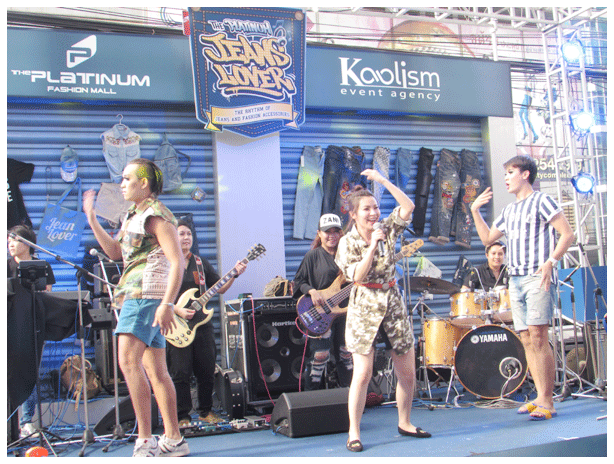 | ........นอกจากจะมีโครงการสนับสนุนผู้ผลิตสินค้าแฟชั่นไทยแล้ว ในส่วนของ ศูนย์การค้า เดอะ แพลทินัม แฟชั่น มอลล์ เอง ยังมีการจัดกิจกรรมและโปรโมชั่นต่างๆ เพื่อดึงดูดนักท่องเที่ยวอยู่ตลอดเวลา โดยล่าสุดได้มีการจับมือกับ 50 ดีไซน์เนอร์และร้านยีนส์ จัดมหกรรมคนรักยีนส์ "The Platinum Jeans Lover 2015" ขึ้น เป็นครั้งที่ 2 โดยการจัดงานครั้งนี้เป็นการจัดงานที่รวมเสื้อผ้าแฟชั่นยีนส์ เครื่องหนัง และ เครื่องประดับ ที่ใหญ่ที่สุดในย่านประตูน้ำ โดยบรรยากาศภายในงานถูกออกแบบตกแต่งภายใต้แนวคิด "ท่วงทำนองแห่งแฟชั่นยีนส์และเครื่องประดับ" (The Rhythm of Jeans and Fashion Accessories) พร้อมนำเสนอแฟชั่นยีนส์ 4 สไตล์ ทั้ง POP Art Jeans, K-POP Jeans, Rock Jeans และ Hip Hop Jeans ........ | |