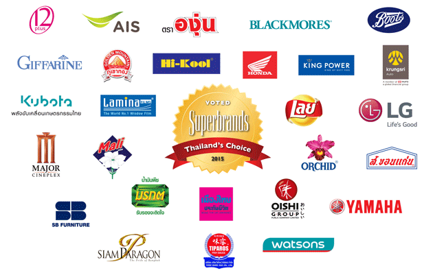 are the lists of the Superbrands 2015: 12 Plus, AIS, Angoon, Blackmores, Boots, Giffarine, Golden Mountain, Hi-Kool, Honda, King Power, Krungsri Auto, Kubota, Lamina, Lay's, LG, Major Cineplex, Mali, Morakot, Muang Thai Life Assurance, Oishi, Orchid, S. Khonkaen, S.B. Furniture, Siam Paragon, Tiparos, Watsons, and Yamaha |