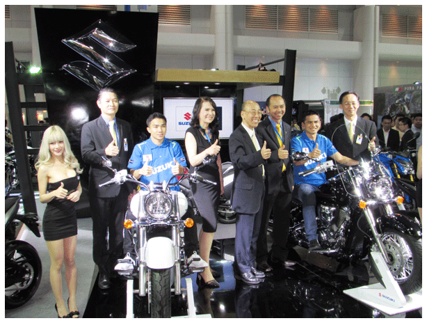........โดยงาน Motor Expo ในครั้งนี้ บริษัท ไทยซูซูกิมอเตอร์ จำกัด ผู้ผลิตและจัดจำหน่ายรถจักรยานยนต์ระดับโลก ได้เข้าร่วมในการเปิดบูธอย่างยิ่งใหญ่ ภายใต้แนวความคิดที่จะนำเทคโนโลยีของรถจักรยานยนต์ที่สามารถตอบสนองความต้องการการใช้งานของผู้บริโภค และเป็นผู้นำรถจักรยานยนต์ระดับพรีเมี่ยม อันเป็นเอกลักษณ์ที่ไม่เหมือนใครนำเสนอต่อทุกท่านภายในงานซูซูกิ มีความยินดีที่จะให้ทุกท่านได้พบกับบูธของเรา ที่จะมาพร้อมกับรถจักรยานยนต์ซูซูกิ บิ๊กไบค์ ระดับ High End ที่ผลิตในประเทศญี่ปุ่นที่มีมาตรฐานและคุณภาพสูง สามารถปลุกเร้าความสนุกสนาน, ความเร้าใจ ในการขับขี่ทุกครั้งที่สัมผัส และคอนเซ็ปต์ ซูซูกิ พรีเมี่ยม บิ๊กไบค์ โชว์รูม ที่เปรียบเสมือนสถานที่ที่ทุกท่านสามารถไปเยี่ยมชม ได้อย่างใกล้ชิด และเป็นกันเองประหนึ่งเป็นครอบครัวเดียวกันกับ "ซูซูกิ" แนวความคิดการออกแบบบูธ ซูซูกิ นั่น ยังคงความเป็นเอกลักษณ์ คือ ซูซูกิ บิ๊กไบค์ โชว์รูม ที่ผสมผสานคำนิยามต่างๆไว้ด้วยกัน ด้วยคำว่า ความเร็ว (SPEED), การแข่งขันที่เร้าใจ (SPORT) และความเหนือระดับ (SUPERIOR) ซึ่งทั้งหมดนี้สามารถสื่อถึงตัวตนของรถจักรยานยนต์ของซูซูกิ ได้อย่างสมบูรณ์ อีกทั้งภายในบูธยังตกแต่งด้วย สีดำ และสีเงินเป็นหลัก ให้ความรู้สึกหรูหรา และดุดัน พร้อมตกแต่งด้วยลายไม้ เพื่อสื่อถึงความเป็นมิตรต่อสิ่งแวดล้อม ตามคอนเซ็ปต์ของงาน Motor Expo ในปีนี้อีกด้วย ........ทั้งนี้ ซูซูกิ ยังได้นำรถจักรยานยนต์ระดับโลกที่เปี่ยมไปด้วยสมรรถนะ และเป็นที่ยอมรับจากทั่วโลกมาจัดแสดงในงานแบบเต็มสตรีม เพื่อให้ทุกท่านสามารถได้สัมผัสกับนวัตกรรมที่ล้ำหน้าไปด้วยเทคโนโลยีต่างๆ ที่ถูกบรรจุอยู่ในรถจักรยานยนต์ ซูซูกิ บิ๊กไบค์ ทุกรุ่น ด้วยเสียงคำรามที่เปล่งออกมาพร้อมกับการกลั่นกรองที่เต็มไปด้วยประสิทธิภาพ ที่เต็มไปด้วยสไตล์การขับขี่ที่เรียบง่าย, ผ่อนคลาย และสะดวกสบายหรูหรา ลวดลายกราฟฟิกที่สง่างามมาพร้อมกับวัสดุสีโครเมี่ยมเงางาม พร้อมความละเอียดทางวิศวกรรมขั้นสูง โดดเด่นในทุกตารางนิ้วผสมผสานความอัจฉริยะ ที่ยากเกินต้านทาน ซึ่งกลั่นออกมาจากประสบการณ์แบบดั้งเดิมที่มาพร้อมเทคโนโลยีที่ล้ำสมัย ........ด้วยเครื่องยนต์ 2 สูบ แบบ V-Twin 45o SOHC 4 วาวล์ / 1 สูบ 4 จังหวะ ขนาด 805 ซีซี พร้อมระบบระบายความร้อนด้วยน้ำ ให้แรงบิดได้เต็มพิกัด และสามารถตอบสนองการขับขี่สไตล์ครูสเซอร์ได้อย่างเต็มที่ อีกทั้งยังได้นำเทคโนโลยีระบบการจ่ายน้ำมันเชื้อเพลิงแบบหัวฉีดที่มีประสิทธิภาพ ทำให้การเผาไหม้สมบูรณ์ และสามารถตอบสนองในทุกย่านควา
