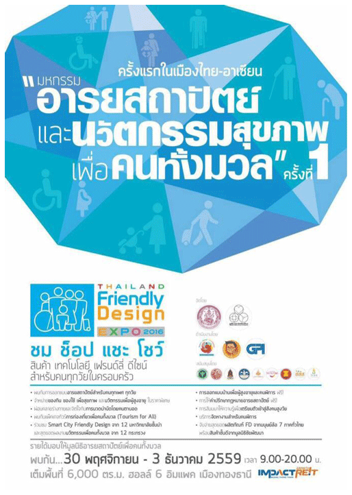 ไฮไลค์ในงาน อาทิ ........- การออกแบบอารยสถาปัตย์สำหรับคนทุกเพศทุกวัย........ ........- จำหน่ายของกิน ของใช้ เพื่อสุขภาพ และนวัตกรรมเพื่อผู้สูงอายุ ผู้พักฟื้น ผู้พิการ ผู้ที่ใช้รถเข็น ฯลฯ ในราคาพิเศษ ........- การนวดบำบัดโดยคนตาบอด เพื่อผ่อนคลายร่างกายและจิตใจ ........- ชิมอาหารจากภัตตาคารมืด ครั้งแรกของเมืองไทย ........- แพ็คเกจทัวร์เพื่อการท่องเที่ยว ........- ตัวอย่างการออกแบบบ้าน เพื่อผู้สูงอายุและคนพิการ ฟรี! ........- การให้คำปรึกษากฎหมายอารยสถาปัตย์ ฟรี! ........- การสัมมนาเพื่อเตรียมเข้าสู่สังคมสูงวัย ........- จัดหางาน สำหรับคนพิการ ........- ประมูลเหรียญกริ่งหนุมานอารยสถาปัตย์ ออกแบบโดย อ.เฉลิมชัย โฆษิตพิพัฒน์ ศิลปินแห่งชาติ วันที่ : 30 พฤศจิกายน - 3 ธันวาคม 2559 สถานที่ : อิมแพ็ค เมืองทองธานี Hall 6 |
