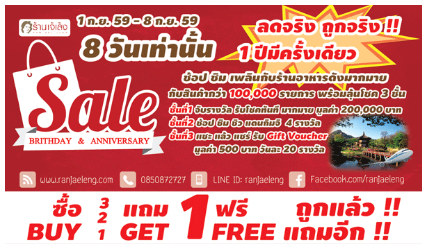 1-8 กันยายน 2559 ใครที่เป็นลูกค้าร้านเจ้เล้งมาตลอด พลาดไม่ได้กับการคืนกำไรให้กับลูกค้าครั้งสำคัญของปี