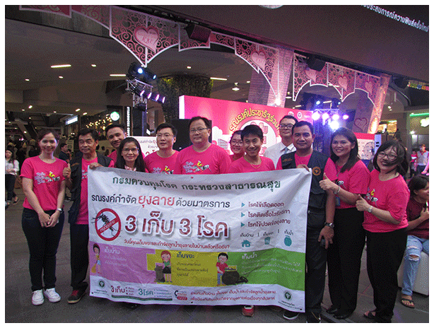 | ........นายแพทย์อำนวย กล่าวอีกว่า ในวันนี้ กรมควบคุมโรคได้จัดกิจกรรมรณรงค์ตามโครงการ "ประชารัฐร่วมใจ 3 เก็บ ป้องกัน 3 โรค" ในเขตกรุงเทพฯ เพื่อให้ประชาชน โดยเฉพาะในชุมชนเขตเมืองเกิดความตระหนัก และเล็งเห็นถึงความสำคัญของโรคที่เกิดจากยุงลายเป็นพาหะ โดยเน้นให้ทุกครัวเรือนเร่งกำจัดลูกน้ำยุงลาย หรือทำลายแหล่งเพาะพันธุ์ยุงลาย จัดเก็บบ้านและที่ทำงานให้สะอาดเรียบร้อย อย่างน้อยสัปดาห์ละ 1 ครั้ง ตามาตรการ 3 เก็บ ป้องกัน 3 โรค ซึ่งกิจกรรมได้รับความร่วมมือจากทั้งภาครัฐ และภาคเอกชน ได้แก่ จุฬาลงกรณ์มหาวิทยาลัย เอื้อเฟื้อสถานที่, บริษัท จีเอ็มเอ็ม แกรมมี่ จำกัด(มหาชน), บริษัทแปซิฟิกา จำกัด, บริษัท คาร์มาร์ท จำกัด มหาชน, บริษัท Click Radio จำกัด,บริษัท มาลีสามพราน จำกัด, บริษัท คริสปี ครีม โดนัท เทรดดิ้ง(ไทยแลนด์) จำกัด ร่วมสนับสนุนกิจกรรมและของรางวัล ส่วนดารา/นักแสดง ที่ร่วมรณรงค์ครั้งนี้ได้แก่ คุณภาคิน คำวิลัยศักดิ์(โตโน่), คุณอัษฎาพร สิริวัฒน์ธนกุล(กรีน), คุณสวิส เตชภูวนนท์ และคุณนันทวัน รุ่งวงศ์พาณิชย์ ผู้เขียนบทละครปดิวรัดา | |