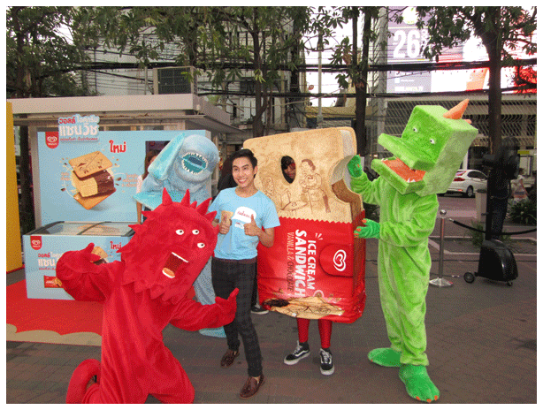 " เชียงใหม่ ( ถนนคนเดินรวมโชค , ถนนคนเดินท่าแพ , มหาวิทยาลัยเชียงใหม่ , โครงการมาลินพลาซ่า ) " อุดรธานี ( มหาวิทยาลัยอุดรธานี , ถนนคนเดิน ) " หาดใหญ่ ( มหาวิทยาลัยสงขลานครินทร์ , กรีนเวย์มาร์เก็ต ) และสงกรานต์นี้ ได้คลายร้อนกันเต็มที่ กับทัพไอติม วอลล์ ไอศกรีม แซนวิซ ที่จะมาแจกความสดใส สดชื่น คลายร้อน ระหว่างเดินทาง ที่จุดพักรถวังน้อย(อยุธยา) วังมะนาว(ขาออก) และมอเตอร์เวย์ชลบุรี(ขาออก) |