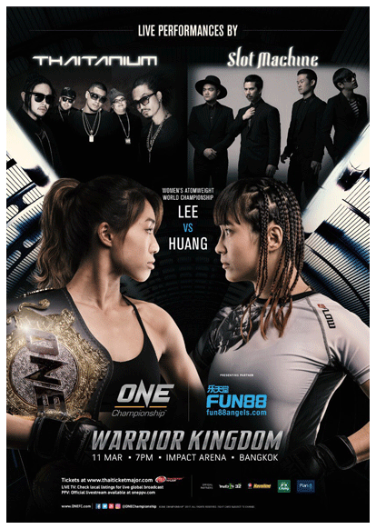 | ........ด้านนายสุกี้-กมล สุโกศล แคลปป์ ประธานบริษัท วัน แชมเปี้ยนชิพ ประเทศไทย กล่าวเพิ่มเติมว่า "รู้สึกตื่นเต้นและยินดีอย่างยิ่งที่งาน ONE: Warrior Kingdom จะกลับมาสร้างความบันเทิงให้กับแฟนๆชาวไทยอย่างยิ่งใหญ่อีกครั้ง ทั้งการแข่งขัน MMA ปะทะกับคอนเสิร์ตของ 2 วงชั้นนำที่เตรียมความพิเศษอัดแน่นตลอด 6 ชั่วโมง และในครั้งนี้จะมีนักสู้ชาวไทยขึ้นสังเวียนอย่างคับคั่งเลยอยากชวนคนไทยมาช่วยส่งกำลังใจให้กับนักชกชาวไทยให้กระหึ่มเวทีที่ อิมแพ็ค อารีน่าในวันที่ 11 มีนาคมนี้กันครับ" แองเจล่า ลี จากฮาวาย หนึ่งในนักสู้รุ่นใหม่ที่น่าจับตามองมากที่สุดในวงการซึ่งพร้อมขึ้นชกในทุกรุ่นโดยไม่เกี่ยงน้ำหนักโดยลีเป็นนักชกลูกครึ่งแคนาเดียนเกาหลีเชื้อสายสิงคโปร์โดยเข้าร่วมฝึกฝนเส้นทาง MMA กับยิมชั้นนำของเอเชียอย่าง Evolve-MMA เธอเชี่ยวชาญเทคนิคการต่อสู้ไม่ว่าจะเป็นการเตะ ต่อย (Strike) การล็อคหรือจับกด (Grapping) ที่เธอได้พิสูจน์ให้แฟนๆทั่วโลกเห็นแล้วว่านี่คือสูตรสำเร็จของการต่อสู้จากการที่ยังไม่เคยแพ้ใครในตลอดเส้นทางการแข่งขัน MMA และไฟท์ล่าสุดเธอได้คว้าแชมป์โลกรุ่นอะตอมเวตหญิงจากการโค่นเมอิ ยามากูจิ ในครั้งนี้เองเธอจะกลับมาป้องกันตำแหน่งแชมป์ครั้งแรกกับ เจนนี่ ฮวง | |