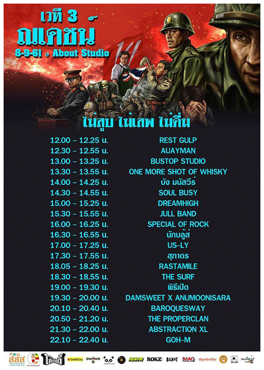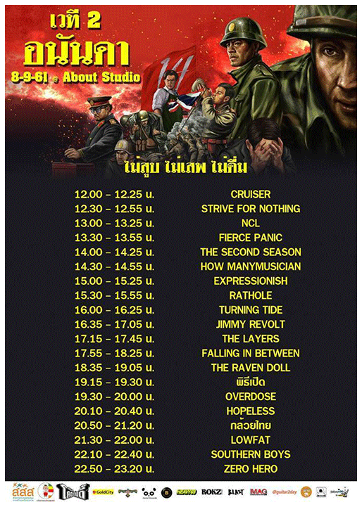 FIERCE PANIC / CRUISER / ELIMINATE / EXPRESSIONISH / HOW MANY / JULLBAND / LEMON FROM MARS / LICK ME / LITTLE PROJECT PLUS / NCL / ODYSSEY / ONE MORE SHOT OF WISHKY / PAULGUNT / RASTAMILE / RAT HOLE / REAL DAWG / RESTGULP/ SHEEPHYPE / SLUM / SOUL BUSY / SPECIAL OF ROCK / STRIVE FOR NOTHING / THE BEDS / THE SECOND SEASON / THE SURF / T-MAA / US-LY / DREAMHIGH / นักบลู้ส์ / บัง มนัสวีร์ / TURNING TIDE / สุภาดร / DAMNSWEET x ANUMOONISARA / SICKCHILD / |