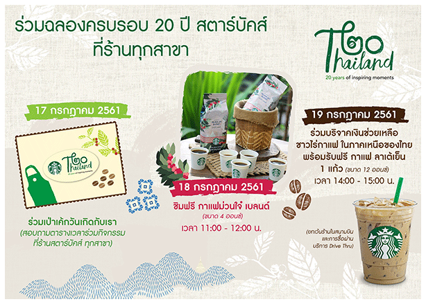 16 กรกฎาคม 2561 ในโอกาสสุดพิเศษครบรอบ 20 ปีในประเทศไทย สตาร์บัคส์ขอมอบกิจกรรมพิเศษสำหรับลูกค้าตลอดทั้งสัปดาห์ที่ร้านสตาร์บัคส์ทุกสาขา