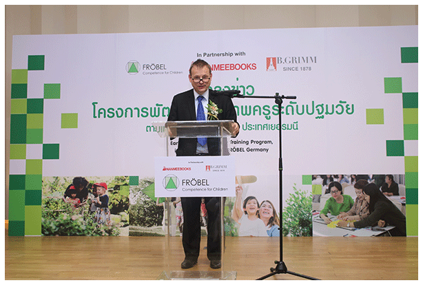 ประเทศเยอรมนี บริษัท นานมีบุ๊คส์ จำกัด และบี.กริม โดยทั้ง 3 องค์กรจับมือกัน เพื่อเป้าหมายพัฒนาคุณภาพการจัดการเรียนรู้ระดับปฐมวัยให้ยั่งยืนมากและมีคุณภาพมากยิ่งขึ้น ........ในการนี้ "โครงการพัฒนาศักยภาพครูปฐมวัย" Early Childhood Teacher Training Program, in Collaboration with FR?BEL Germanyช่วยสร้างรากฐานเด็กตั้งแต่ปฐมวัย เพาะต้นกล้าให้แข็งแกร่ง มุ่งเน้นให้ผู้สอนจัดการเรียนรู้ปฐมวัยให้เหมาะสม ร่วมเป็นส่วนหนึ่งในการสร้างความเปลี่ยนแปลงทางการศึกษาได้จริง โดยใช้ความต้องการของเด็กเป็นหลักในการขับเคลื่อน ด้วยแนวคิด "เคารพสิทธิเด็ก คือ หัวใจของ "โฟรเบล" ให้เด็กมีโอกาสเติบโตไปเป็นพลเมืองโลกที่ช่างสงสัย มีความสามารถ เอื้ออาทร และตอบแทนสังคม ซึ่งต้องเริ่มปลูกฝังตั้งแต่ปฐมวัย ........ดร.ธีระชัย พรสินศิริรักษ์ ประธานเจ้าหน้าที่กลยุทธ์องค์กร บี.กริม กล่าวว่าสำหรับการเปิดตัว "โครงการพัฒนาศักยภาพครูปฐมวัย" ตามแนวทางมูลนิธิโฟรเบล ประเทศเยอรมนี เกิดขึ้นจากแนวคิดที่เห็นร่วมกัน ระหว่าง บี.กริม บริษัท นานมีบุ๊คส์ และ มูลนิธิโฟรเบล ประเทศเยอรมนี ที่มองว่าปัจจุบันโลกมีการเปลี่ยนแปลงอยู่ตลอดเวลา การที่เด็กสามารถสร้างกระบวนการคิดวิเคราะห์ แก้ไขปัญหาได้เท่าทันต่อสิ่งรอบตัวนั้นเป็นสิ่งสำคัญ โดยโฟรเบล เชื่อเรื่องการเรียนรู้ผ่านการเล่นเพราะเป็นการเปิดโอกาสให้เด็กๆทดสอบตัวเอง และมีปฏิสัมพันธ์กับเพื่อนๆและผู้ใหญ่ ยึดหลักเคารพสิทธิเด็ก เพื่อส่งผลไปยังประสบการณ์ของเด็กโดยตรง มีสิทธิในการตั้งคำถามและค้นหาคำตอบด้วยตัวเอง ให้เติบโตเป็นสมาชิกของสังคมที่มีอิสระ พึ่งพาตนเองได้ เชื่อมั่นในตนเอง และมีความคิดสร้างสรรค์ เพื่อให้บรรลุดังเป้าหมายของโฟรเบลที่วางไว้ คือ การพัฒนาเด็กให้มีความมั่นใจ และใช้ชีวิตร่วมกันในสังคมประชาธิปไตยอย่างมีความรับผิดชอบ | |