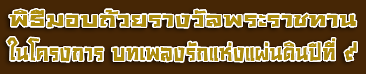 อยากฝากถึงน้องๆรุ่นต่อไปที่มีความฝันว่า การฝึกซ้อม มุ่งมั่น และการเป็นทีมเวิร์คที่ดีเป็นสิ่งสำคัญอย่างยิ่งที่จะพาไปสู่ความสำเร็จที่สวยงามเหมือนพวกเรา ........โอ๋ - ดูบาดู หนึ่งในคณะกรรมการ กล่าวถึงเวิร์คชอปทางดนตรี ที่ค่ายกําแพงเพชรอัครโยธิน จังหวัดสมุทรสาคร จำนวน 3 วัน 2 คืนที่ผ่านมาว่า "ตนรู้สึกภูมิใจที่เห็นเยาวชนไทยทุ่มเท มุ่งมั่น ฝึกซ้อม ในการเก็บตัวเข้าร่วมกิจกรรมเวิร์คชอปดังกล่าว โดยเยาวชนที่เข้าร่วมโครงการฯ จะได้รับองค์ความรู้ใหม่ๆ และเทคนิคด้านดนตรีที่จะสามารถนำไปพัฒนาตนเองต่อไปในอนาคต ผ่านการเข้าร่วมเวิร์คชอป และหวังเป็นอย่างยิ่งว่าตัวแทนคนรุ่นใหม่ที่มีคุณภาพเหล่านี้จะเป็นกำลังสำคัญของประเทศชาติในอนาคตต่อไป" ........สำหรับ โครงการบทเพลงรักแห่งแผ่นดินปีที่ ๙ ภายใต้แนวคิด "สืบสาน จิตอาสา ร้องบรรเลง บทเพลงพระราชนิพนธ์" นี้ จัดขึ้นเนื่องด้วยในปีนี้เป็นปีพระบรมราชาภิเษกสมเด็จพระเจ้าอยู่หัวมหาวชิราลงกรณบดินทรเทพยวรางกูร ถือเป็นโอกาสอันเหมาะสมที่ประชาชนทุกหมู่เหล่าควรแก่การแสดงความจงรักภักดีแด่พระองค์ท่านและสถาบันพระมหากษัตริย์ ซึ่งเป็นศูนย์รวมจิตใจของประชาชนคนไทย โดยเน้น 'การทำความดี ทำให้ด้วยใจ'" โดยมุ่งหวังในการส่งเสริมและผลักดันให้เยาวชนจากทั่วประเทศให้มีโอกาสแสดงความสามารถในทักษะด้านดนตรี ได้ใช้เวลาเรียนรู้และแลกเปลี่ยนความคิดเห็นกันร่วมกัน ตลอดจนร่วมแสดงพลังถวายความจงรักภักดีต่อสถาบันชาติ ศาสนา พระมหากษัตริย์ อย่างพร้อมเพรียงกันผ่านบทเพลงอันทรงเกียรติ ........สำหรับการแข่งขันรอบตัดสิน ชิงถ้วยรางวัลพระราชทาน สมเด็จพระนางเจ้าสิริกิติ์ พระบรมราชินีนาถ พระบรมราชชนนีพันปีหลวง ออกแบบโดยอาจารย์ เฉลิมชัย โฆษิตพิพัฒน์ พร้อมทุนการศึกษา ณ ลานอีเดน ศูนย์การค้าเซ็นทรัลเวิลด์ | |