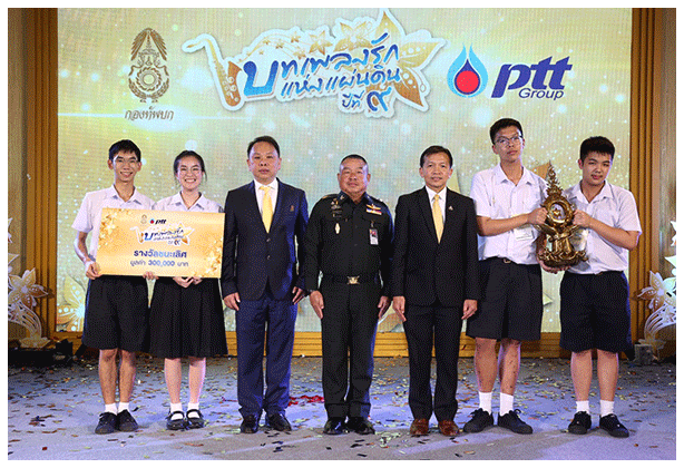 ด้วยความสำนึกในพระมหากรุณาธิคุณ ........โครงการ "บทเพลงรักแห่งแผ่นดิน" ภายใต้แนวคิด "สืบสาน จิตอาสา ร้องบรรเลง บทเพลงพระราชนิพนธ์" ปีที่ ๙ ด้วยความร่วมมือของ กองทัพบก และบริษัท ปตท. จำกัด (มหาชน) ในครั้งนี้ ได้รับการตอบรับเป็นอย่างดีจากเยาวชนทั่วประเทศ โดยมีวงส่งผลงานเข้าประกวดกว่า 1,000 คลิป ใน 5 ภูมิภาค โดย - วงชนะเลิศในปีนี้ได้แก่ วงณัฐชัยธัช จากโรงเรียนเตรียมอุดมศึกษา จ. กรุงเทพมหานคร - รองชนะเลิศอันดับที่ 1 วง b.k.band แดนสนธยา จากโรงเรียนบึงกาฬ - รางวัลรองชนะเลิศ อันดับ 2 วง RO.Mens จากโรงเรียนวัดราชโอรส - รางวัล Popular Vote วง RO. Mens จากโรงเรียนวัดราชโอรส - รางวัลชมเชย 2 รางวัล วง S.T. BAND จากโรงเรียนวัดทรงธรรม วง Dreamfeel จากโรงเรียนสุราษฏร์ธานี - รางวัลนักร้องยอดเยี่ยม นางสาวอัจฉริยา จินดาวงศ์ (ป่อปอ) โรงเรียนวัดทรงธรรม - รางวัลนักดนตรียอดเยี่ยม เด็กชาย ศุภกร สอนประสม (ปลื้ม) "กลอง" โรงเรียน สุราษฎร์ธานี ........โดยการเฟ้นหาสุดยอดวงตัวแทนของ 5 ภูมิภาค จากทั่วประเทศในค่ำคืนนี้ ร่วมตัดสินโดยคณะกรรมการผู้ทรงคุณวุฒิ อาทิ เพชร์ มาร์ โปรดิวเซอร์ และคอมเมนเตเตอร์ประจำรายการ เดอะสตาร์ ค้นฟ้าคว้าดาว, ซานิ, เอ๊ะ ละอองฟอง ที่มาร่วมค้นหาสุดยอดวงดนตรี นักเรียนนักศึกษาจากทั่วประเทศเข้าสู่รอบชิงชนะเลิศ ชิงถ้วยรางวัลพระราชทานสมเด็จพระนางเจ้าสิริกิติ์ พระบรมราชินีนาถ พระบรมราชชนนีพันปีหลวง พร้อมทุนการศึกษา ภาพวงชนะเลิศ ตัวแทนจากวงณัฐชัยธัช จากโรงเรียนเตรียมอุดมศึกษา น.ส. ภณิตา สิงห์ณรงค์ (นักร้องนำ) และมือเบส นาย-ถิรคุณ มาศศรี กล่าวถึงการแข่งขันในครั้งนี้ว่า ทีมทราบข่าวจากทางโรงเรียน โดยในการแข่งขันบทเพลงรักแห่งแผ่นดินปีที่ 6 รุ่นพี่ได้ทำแชมป์เอาไว้ และตนได้มีโอกาสเข้าร่วมแข่งขัน และคว้ารางวัลรองชนะเลิศอันดับที่ 1 ในการแข่งขันบทเพลงรักแห่งแผ่นดินปีที่ 7 ........สำหรับการแข่งขันในปีนี้ มีการเตรียมตัวค่อนข้างน้อย โดยใช้เวลาฝึกซ้อมในการแข่งขันทั้งหมด 3 เดือน กะทันหัน แต่โชคดีที่มีทีมเวิร์คที่ดี โดยมีสมาชิกทั้งหมด 15 คน ทุกคนในทีมที่เข้ามาปรับตัวได้เร็ว การสมัครเข้าร่วมแข่งขันในครั้งนี้ถือเป็นโอกาสที่ดีที่ได้พัฒนาต่อยอดความสามารถทางด้านดนตรี โดยเฉพาะการได้เข้าค่าย ได้เรียนรู้เทคนิคทางดนตรีจากอ. โอ๋ - ดูบาดู ที่ให้คำแนะนำและคอมเม้นท์อย่างตรงไปตรงมา สามารถนำมาปรับใช้ได้ และได้เรียนรู้เรื่องความมีระเบียบวินัย ในการฝึกซ้อมระหว่างเข้าค่าย รวมถึงการใช้เวลาอยู่ร่วมกันอย่างสร้างสรรค์ ........สำหรับความรู้สึกที่ได้รับรางวัล พวกเราดีใจมาก เพราะรางวัลที่ได้รับใ