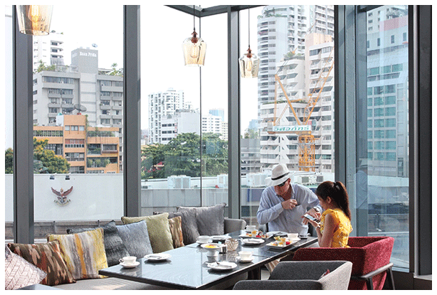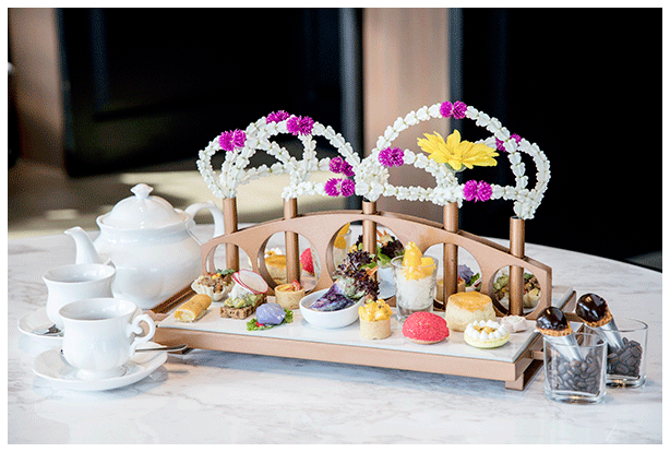 | ........นอกจากนั้นที่บริเวณสุขุมวิทแกลเลอรี่ยังเสิร์ฟอาฟเตอร์นูน ที ออกแบบธีมโดย คุณสกุล อินทกุล ศิลปินนักจัดดอกไม้ระดับนานาชาติ ที่ได้รับแรงบันดาลใจจากหนึ่งในภาพของ สุขุมวิท แกลเลอรี่ นั่นคือภาพของสะพานลอย เอกมัย ตั้งอยู่ที่แยกซอยเอกมัย (สุขุมวิท ซอย 63) เป็นสะพานลอยที่มีรูปแบบล้ำสมัยในยุคนั้น เป็นที่จดจำได้ของหลายๆ คน เมื่อได้โครงรูปแบบของถาดอาฟเตอร์นูน ที เป็นที่เรียบร้อย จึงสั่งทำ ซึ่งถาดทุกถาดเป็นงานประดิษฐ์ ทำมือโดยช่างปฏิมากร ทำจากสแตนเลสชุบทองแดงและหินอ่อนเทียม และเลือกดอกไม้เพื่อใช้ตกแต่งถาดให้ดูมีมิติ โดยชุดที่เป็นซิกเนเจอร์ของโรงแรมฯ คุณสกุลเลือกตกแต่งสไตล์ไทยร่วมสมัย ด้วยการเลือกใช้ดอกรัก ดอกบานไม่รู้โรย จัดให้เป็นทรงคลื่นสูงต่ำ ซึ่งความหมายของการตกแต่งนี้ คือ 1. สีม่วง-ขาว เป็นสีของแบรนด์ไฮแอท รีเจนซี่ 2. เป็นแนวไทยร่วมสมัยเหมือนคอนเซ็ปต์ตกแต่งโรงแรม 3. คลื่นดอกไม้ สื่อถึงความไม่เคยหยุดนิ่งของถนนสุขุมวิท 4. ดอกไม้ที่ปักตั้งเพียง 1 ดอก เป็นตัวแทนของโรงแรมที่โดดเด่น ลายล้อมไปด้วยสิ่งแวดล้อมที่มีความหลากหลาย ผู้ที่รับประทาน อาฟเตอร์นูน ที ที่ สุขุมวิท แกลเลอรี่ แห่งนี้ จึงจะได้ลิ้มรสของว่าง 15 ชนิด อิ่มอร่อยไปกับของคาว ของหวาน เบเกอรี่ และขนมเสิร์ฟร้อน ปรุงโดยทีมเชฟของโรงแรม ท่ามกลางบรรยากาศคลาสสิคของ แกลเลอรี่ภาพถ่าย ที่ส่งความรู้สึกถึงความโก้หรู ความเจริญ ความทันสมัย ความไม่หยุดนิ่ง | |