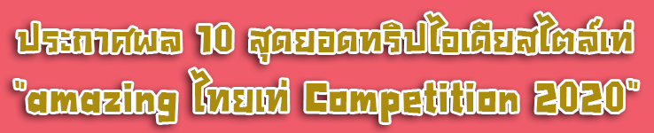 "เมืองไทยสวยทุกที่ เท่ทุกสไตล์" ........การท่องเที่ยวแห่งประเทศไทย (ททท.) ภูมิภาคภาคกลาง ร่วมกับสายการบินไทยสมายล์ สายการบินไทยแอร์เอเชีย สายการบินนกแอร์ รถเช่า AVIS Rent A Car Thailand dtac Canon KEEN Vivo RyoiiReview และ Forever-Young.asia จัดกิจกรรมการแข่งขัน amazing ไทยเท่ Competition 2020 ขึ้น เพื่อเฟ้นหาสุดยอดความคิดสร้างสรรค์ทริปท่องเที่ยวไอเดียเท่ๆ 10 สไตล์ ประกอบด้วย สไตล์ Hipster, Green Lover, Young@Heart, Conqueror, Digital nomad, Social Story, Camera is My life, Voluntourist, Me Myself & I และสไตล์ Foodie ........กิจกรรมครั้งนี้มีผู้สมัครเข้าแข่งขันทั้งสิ้น 260 ทีม จากทั่วประเทศ โดยคณะกรรมการได้คัดเลือก Finalist จำนวนทั้งสิ้น 50 ทีม ซึ่งตลอดเดือนกรกฎาคมที่ผ่านมา ทั้ง 50 ทีม ได้ลงพื้นที่เพื่อทำภารกิจในการนำเสนอสร้างสรรค์ไอเดียและวิธีการเที่ยวในแบบเท่ ๆ ตามแบบฉบับของตน ผ่านมุมมองและแรงบันดาลใจที่สดใหม่ Untold, Unseal ทั้ง 10 สไตล์ ในพื้นที่ 5 ภูมิภาคทั่วประเทศ เพื่อนำไปสู่การแบ่งปันให้ผู้อื่นเกิดแรงบันดาลใจในการท่องเที่ยวตามมาบนแนวคิด "เมืองไทยสวยทุกที่ เท่ทุกสไตล์" ........สำหรับเกณฑ์การตัดสินหาทีมผู้ชนะมีการแบ่งคะแนนออกเป็น 2 ส่วน ประกอบด้วยคะแนนที่มาจากคณะกรรมการ 60% และคะแนน Social Engagement 40% โดยทีมที่มีผลคะแนนรวมสูงสุดจะเป็นผู้ชนะ ได้รับรางวัลมูลค่ารวม 500,000 บาท โดยผลการตัดสิน ผู้ชนะทั้ง 10 ทีม 10 สไตล์ ประกอบด้วย ผู้ชนะสไตล์ Hipster ได้แก่ทีม เที่ยวจนวันลาหมด โปรโมต จังหวัดสุพรรณบุรี คะแนน จำนวน 89.49 คะแนน จากคะแนนเต็ม 100 คะแนน ผู้ชนะสไตล์ Green Lover ได้แก่ทีม ลาออกไหม โปรโมต จังหวัดเชียงใหม่ คะแนน จำนวน 89 คะแนน จากคะแนนเต็ม 100 คะแนน ผู้ชนะสไตล์ Young@Heart ได้แก่ทีม อีหล้าพาลุย โปรโมต จังหวัดปราจีนบุรี คะแนน จำนวน 95 คะแนน จากคะแนนเต็ม 100 คะแนน ผู้ชนะสไตล์ Conqueror ได้แก่ทีม เสพติดเขา โปรโมต จังหวัดกาญจนบุรี คะแนน จำนวน 63 คะแนน จากคะแนนเต็ม 100 คะแนน ผู้ชนะสไตล์ Digital nomad ได้แก่ทีม 1900 miles โปรโมต จังหวัดสมุทรปราการ คะแนน จำนวน 88 คะแนน จากคะแนนเต็ม 100 คะแนน ผู้ชนะสไตล์ Social Story ได้แก่ทีม Crazy Journeys โปรโมต จังหวัดชัยนาท คะแนน จำนวน 93 คะแนน จากคะแนนเต็ม 100 คะแนน ผู้ชนะสไตล์ Camera is My life ได้แก่ทีม CrossCutting Journey โปรโมต จังหวัดสมุทรปราการ คะแนน จำนวน 88 คะแนน จากคะแนนเต็ม 100 คะแนน ผู้ชนะสไตล์ Me Myself & I ได้แก่ทีม Journeyaholic โปรโมต จังหวัดยโสธร คะแนน จำนวน 88 คะแนน จากคะแนนเต็ม 100 คะแนน ผู้ชนะสไตล์ Voluntourist ได้แก่ทีม เที่ยวแล้วยัง โปรโมต จังหวัดตาก คะแนน จำนวน 89 คะแนน จากคะแนนเต็ม 100 คะแนน ผู้ชนะสไตล์ Foodie ได้แก่ทีม หมีเป็ด โปรโมต จังหวัดพัทลุง คะแนน จำนวน 95 คะแนน จากคะแนนเต็ม 100 คะแนน | |
