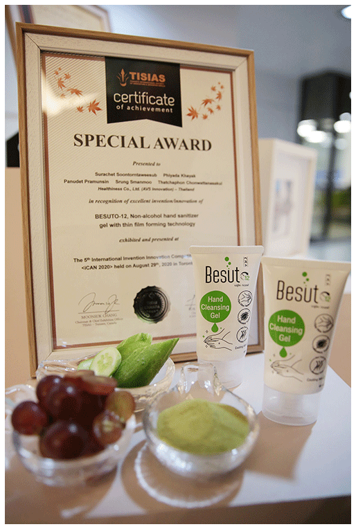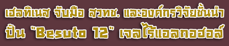 "Besuto 12" (เบซูโตะ ทเวลฟ์) เจลรูปแบบใหม่ไร้แอลกอฮอล์ ........"Besuto 12" เป็นนวัตกรรมเจลฆ่าเชื้อ 'รายแรกที่ผ่านการทดสอบกับเชื้อโควิด-19 จริง' ทั้งยังสามารถช่วยฆ่าเชื้อแบคทีเรีย เชื้อรา รวมถึงสามารถฆ่าเชื้อ RSV ที่กำลังระบาดในกลุ่มเด็กเล็ก ได้มากกว่า 99% ทั้งยังใช้นวัตกรรม "Thin Film Technology " ทำให้สามารถปกป้องได้ยาวนานถึง 12 ชั่วโมง โดยไม่ต้องทาซ้ำ พร้อมคุณสมบัติจากสารสกัดธรรมชาติ Grape Seed Cucumber Extract และ Green Tea Extract ที่ช่วยเพิ่มความชุ่มชื้นให้แก่ผิว ช่วยไม่ให้ผิวแห้งแตก ไม่ระคายเคือง เพราะไม่มีส่วนผสมของแอลกอฮอล์ รับรองความสำเร็จด้วย รางวัลเหรียญเงินและรางวัล Canadian Special Awards จากงานประกวดนวัตกรรม International Invention Innovation Competition (iCan2020) ประเทศแคนาดา ........ทั้งนี้ การพัฒนา "Besuto 12" ยังได้รับการสนับสนุนจากทีมนักวิจัยและสถาบันทางการแพทย์ชั้นนำของประเทศ ในการทดสอบประสิทธิภาพในการป้องกันเชื้อโรค ไม่ว่าจะเป็นการทดสอบกับเชื้อก่อโรค Covid-19 จากภาควิชาจุลชีววิทยาและอิมมิวโนโลยี คณะเวชศาสตร์เขตร้อนมหาวิทยาลัยมหิดล, การทดสอบกับเชื้อ RSV จาก ภาควิชาชีวเวชศาสตร์ คณะแพทยศาสตร์ มหาวิทยาลัยสงขลานครินทร์, การทดสอบ ไวรัส H1N1 จาก สมาคมเวชศาสตร์ชันสูตรทางสัตวแพทย์ไทย คณะสัตวแพทยศาสตร์ จุฬาลงกรณ์มหาวิทยาลัย, การทดสอบ เชื้อ H3N2 และแบคทีเรีย Pseudomonas aeruginosa & Staphylococcus aureus - MRSA & Fungus จาก คณะแพทยศาสตร์ ภาควิชาจุลชีววิทยา จุฬาลงกรณ์มหาวิทยาลัย ซึ่งสามารถยังยั้งเชื้อต่างๆได้ ทำให้มั่นใจได้ในประสิทธิภาพของ "Besuto12" | |