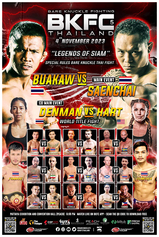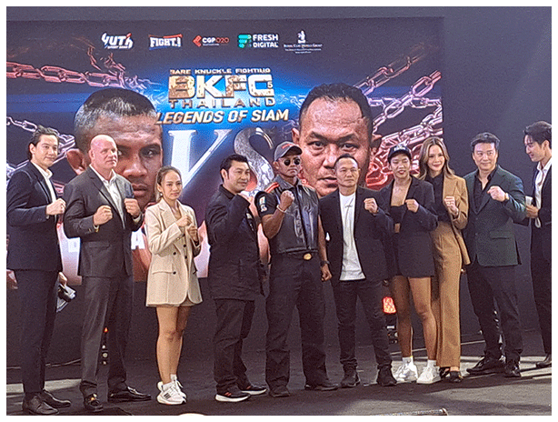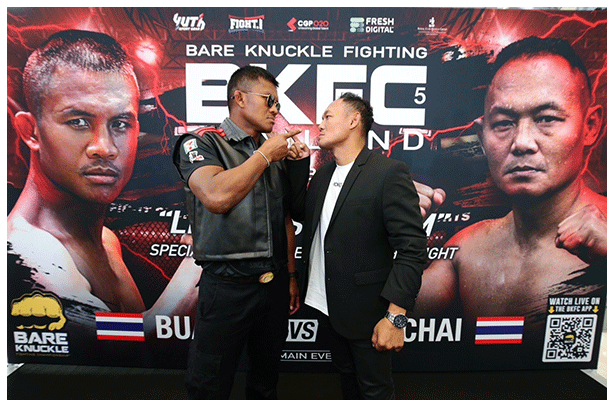 ........BKFC ASIA ประกาศอย่างเป็นทางการ พร้อมระเบิดศึกสะเทือนวงการของ 2 นักสู้ระดับตำนานแห่งยุค กับไฟต์หยุดโลก พร้อมยกทัพจัดเต็มด้วยคู่มวยเดือดชิงแชมป์โลก 2 คู่ ได้แก่ โป เดนแมน (Po Deman) จากประเทศไทย ปะทะ บริเทน ฮาร์ต (Britain Hart) จากสหรัฐอเมริกา และ แฟรงกี้ (Frankke) ปะทะ แสนศึก นครโชคชัย (Seansuek) จอมเดือดเมืองโคราช โดย "BKFC Thailand ครั้งที่ 5 - LEGENDS OF SIAM" อัดแน่นเต็มพิกัดด้วยนักสู้ฝีมือฉกาจจากทั่วโลกรวมทั้งหมด 24 ชีวิต ที่จะมาดวลเดือดกันในการต่อสู้ทั้ง 12 แมตช์ ........มร. นิค แชปแมน ประธานเจ้าหน้าที่บริหารและประธานฝ่ายปฏิบัติการ BKFC ASIA อดีตแชมป์ UK1 British Title Cage Rage (UCMMA) World Title Light Heavyweight กล่าวว่า "ศึก BKFC Thailand ครั้งที่ 5 - LEGENDS OF SIAM ครั้งนี้ นับเป็นการพบกันของสองยอดนักสู้แห่งสยาม ผู้เป็นตำนานที่ยังมีลมหายใจและเป็นครั้งแรก ของ 2 นักชกที่จะมาร่วมประลองฝีไม้ลายมือกัน ภายใต้กติกาใหม่ของเวที BKFC ซึ่งเน้นความดุเดือด ชกจริง เจ็บจริง ระห่ำมากยิ่งขึ้น นั่นคือนักสู้จะชกกันแบบมือเปล่า ไม่สวมนวม โดยในพิกัดน้ำหนัก 68.5 กิโลกรัม กำหนดชกถึง 5 ยก ยกละ 2 นาที ผู้ชมจึงไม่สามารถคาดเดาได้เลยว่าใครจะเป็นผู้คว้าชัยหรือน็อกคาเวทีในครั้งนี้ และตอนนี้ทั้งสองนักชกกำลังซุ่มลับฝีมือกันอย่างเต็มที่ ถึงแม้จะเป็นเพื่อนรักกัน แต่เรื่องของศักดิ์ศรี ไม่มีใครยอมกันแน่นอน" |